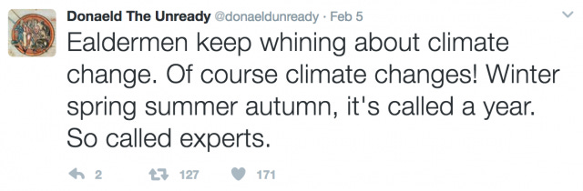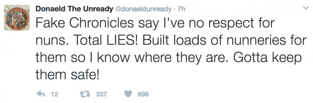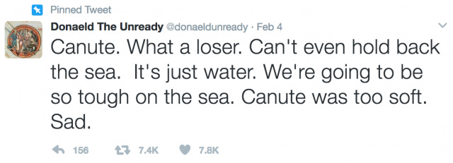 And speaking of batshit medieval Danes - as I always am - one of the more cheering pockets of the internet this week has been @donaeldunready, the Twitter account that re-imagines Trump as a medieval king, obsessed with draining the East Anglian fens, locking up nuns, and building shield walls.